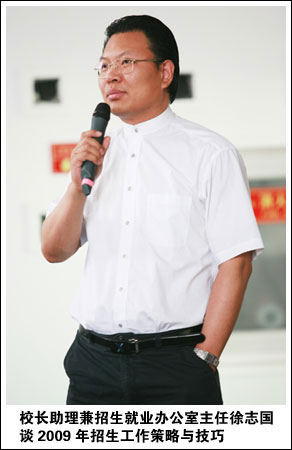5月21日,北京吉利大學(xué)招生就業(yè)辦公室組織的2009年外派招生干事培訓(xùn)啟動(dòng)儀式在影視中心隆重舉行,北京吉利大學(xué)校長(zhǎng)助理兼招生就業(yè)辦公室主任徐志國(guó)用詳實(shí)的數(shù)據(jù)、精煉的語言既深刻剖析了招生工作所面臨的環(huán)境,又突出強(qiáng)調(diào)了北京吉利大學(xué)的辦學(xué)優(yōu)勢(shì)和招生工作策略。