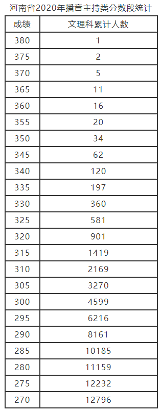 2020年河南省藝術類分數(shù)段統(tǒng)計表,統(tǒng)計表中所包含專業(yè)有:播音主持,表演、音樂、舞蹈含藝術舞蹈、國際標準舞,各專業(yè)具體分數(shù)段如下: