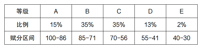 具體來說,A等級(jí)對應(yīng)100~86分,B等級(jí)對應(yīng)85~71分,C等級(jí)對應(yīng)70~56分,D等級(jí)對應(yīng)55~41分,E等級(jí)對應(yīng)40~30分。