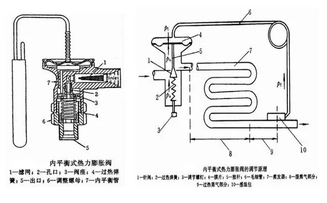 內(nèi)平衡式熱力膨脹閥由閥體、推桿、閥座、閥針、彈簧、調(diào)節(jié)桿、感溫包、聯(lián)接管、感應(yīng)膜片等部件組成。