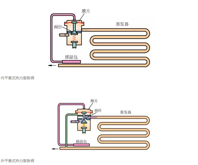 熱力式膨脹閥主要由閥體、感溫包和毛細(xì)管組成。熱力式膨脹閥按膜片平衡方式不同有內(nèi)平衡式和外平衡式兩種類型。