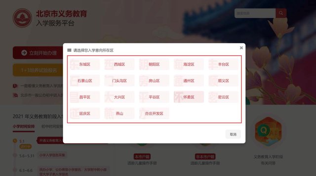 1.在瀏覽器輸入:yjrx.bjedu.cn,打開(kāi)以下頁(yè)面,點(diǎn)擊“立刻開(kāi)始辦理”按鈕后選擇需要進(jìn)行注冊(cè)的區(qū),點(diǎn)擊進(jìn)入。