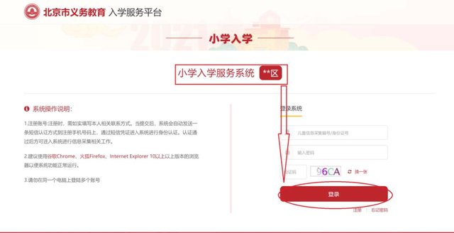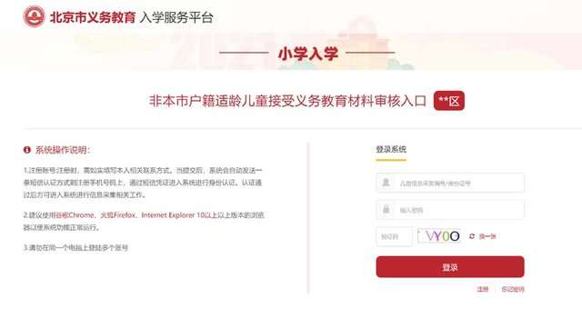 4.在打開(kāi)“小學(xué)入學(xué)服務(wù)系統(tǒng)”登錄頁(yè)面后,輸入在“非本市戶(hù)籍適齡兒童接受義務(wù)教育證明證件材料審核入口”注冊(cè)時(shí)生成的賬號(hào)、密碼和圖片驗(yàn)證碼,點(diǎn)擊“登錄”進(jìn)入系統(tǒng)。
