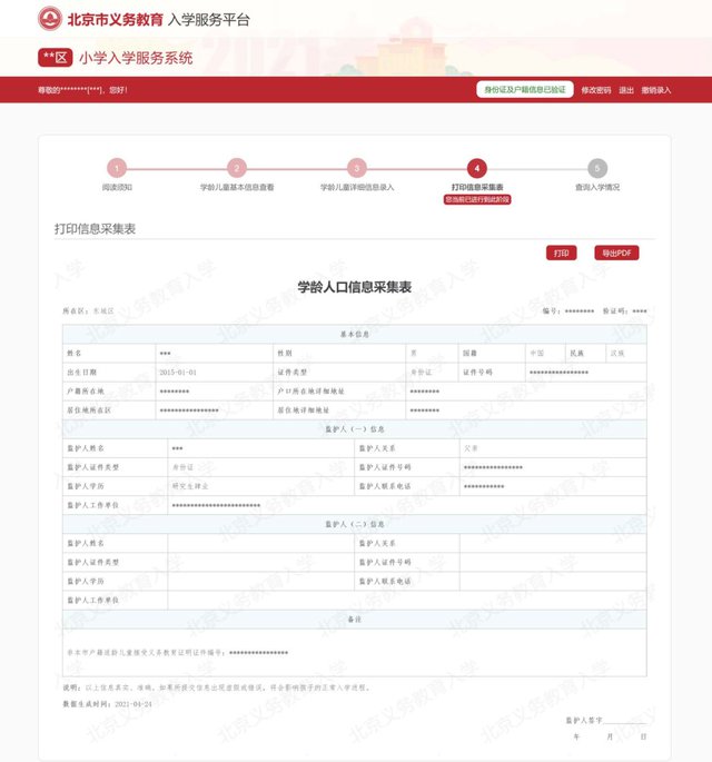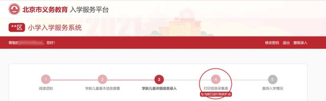 5.成功登錄小學(xué)入學(xué)服務(wù)系統(tǒng)后,確認(rèn)在“非本市戶(hù)籍適齡兒童接受義務(wù)教育證明證件材料審核入口”系統(tǒng)注冊(cè)并同步到此系統(tǒng)內(nèi)的信息無(wú)誤后,用戶(hù)可點(diǎn)擊上方步驟導(dǎo)航處的“④”,打印信息采集表,系統(tǒng)將打開(kāi)新的頁(yè)面顯示信息采集表。