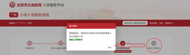 根據(jù)區(qū)安排,用戶(hù)可登錄小學(xué)入學(xué)服務(wù)系統(tǒng)點(diǎn)擊上方步驟導(dǎo)航處的“⑤查詢(xún)?nèi)雽W(xué)學(xué)校情況”,查看入學(xué)結(jié)果。