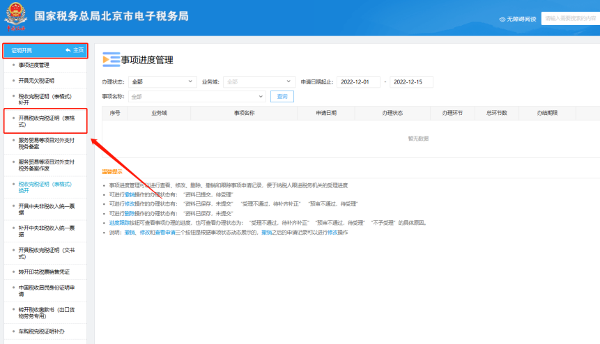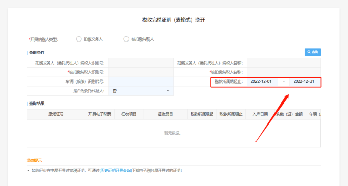 三、開具稅收完稅證明(文書式)頁面,輸入開具日期起止點(diǎn)擊查詢。
